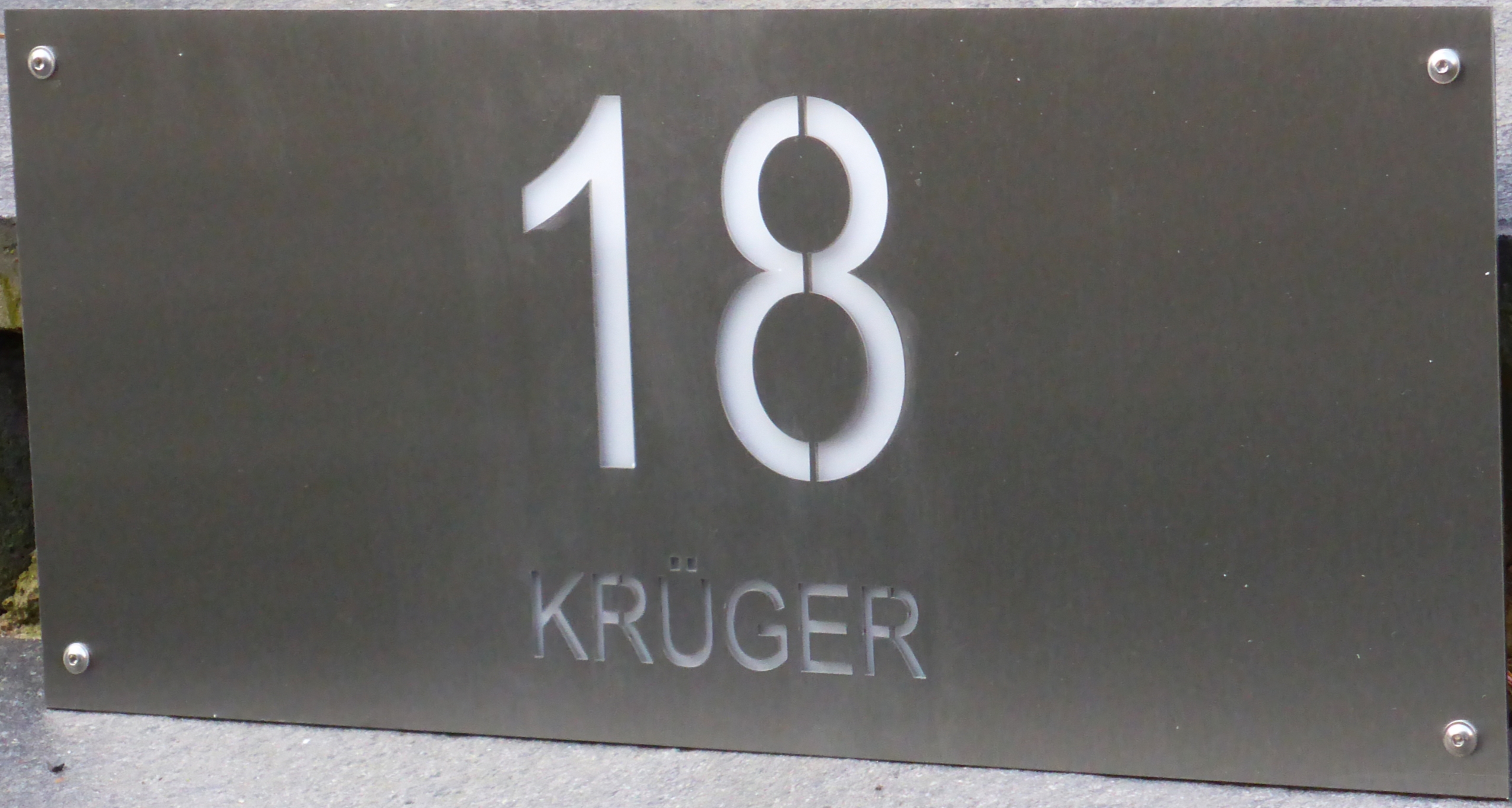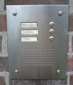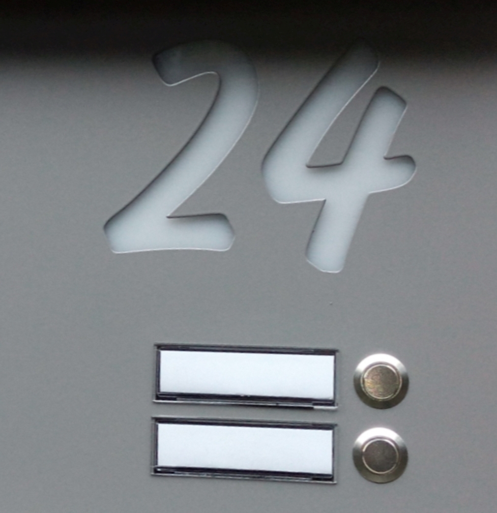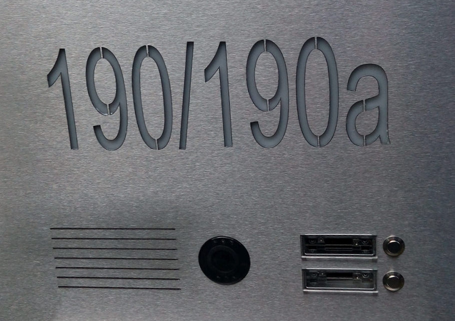 Plexiglasplatten hinter Alu-Front, Klingeltableaus, Hausnummerfrontplatten, Letter und Ziffern ausgelasert.