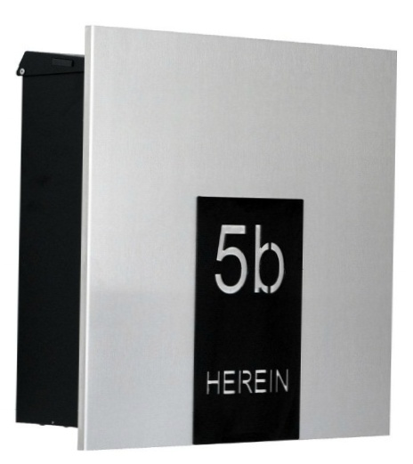 Auf der Front aus Edelstahl ist ein schwarzer Folieneinsatz, der auf Wunsch mit Ihrer Haus-Nr. und/ oder einem Namenszug