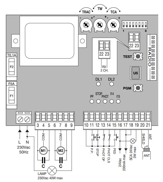 Steuerung für 230 V Antriebe - ein und zweimotorig - besonders für hydraulische Antriebe CAB, BFT, Tousek, Motorline