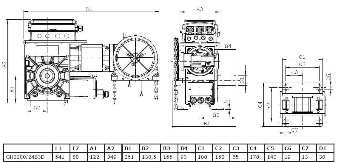 Garog - GH2200/24B3D 220Nm - Wellenantrieb mit Ø30mm Welle, mit Notkette, mechan. Endschaltern, Steuerung AS210B und Taster, 3-fach
